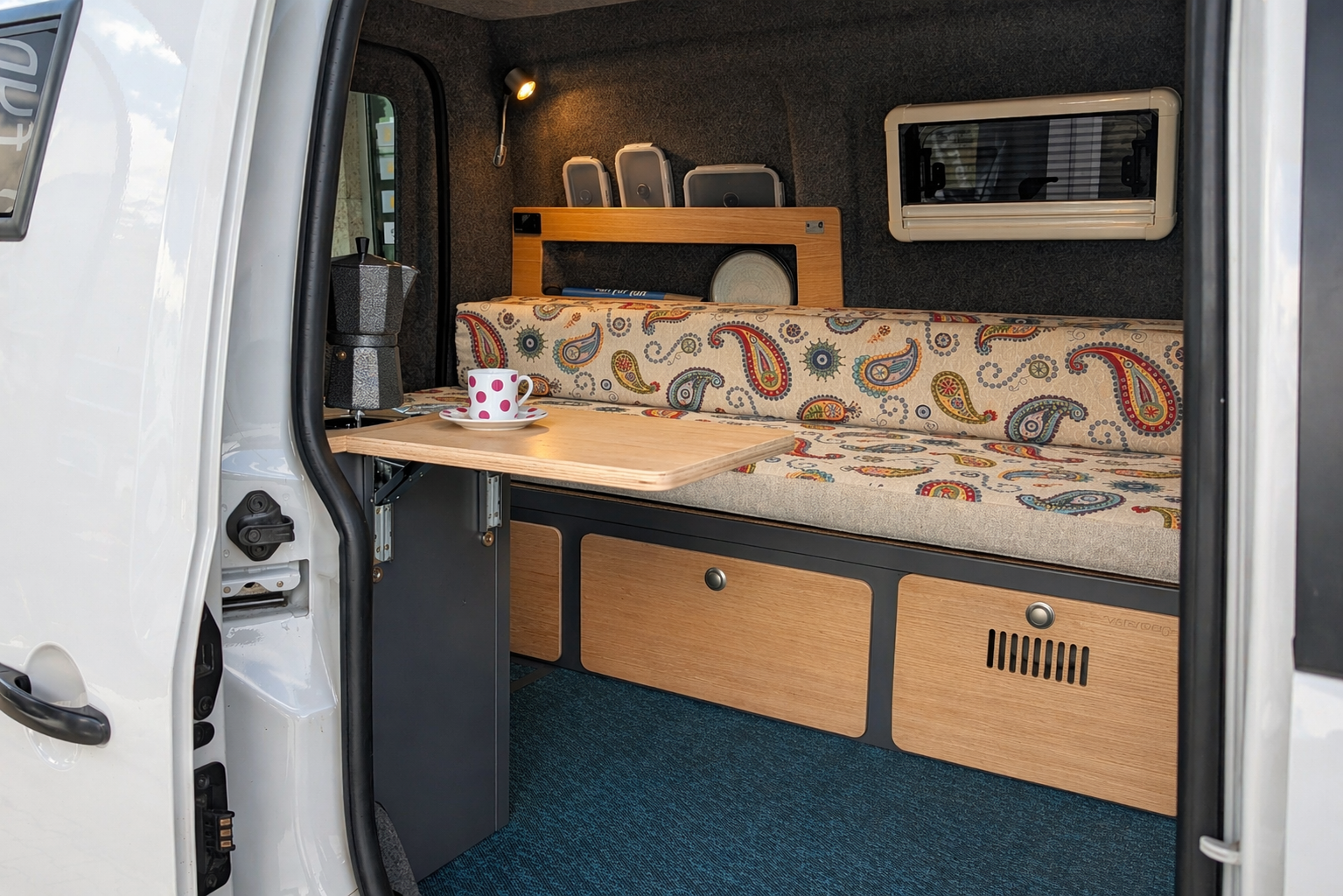 Zur Ausstattung des Fahrzeugs gehören außerdem zwei von uns eingebaute Fenster, darunter ein Heckfenster, ein ausziehbares Bett, ein Kompressor-Kühlschrank sowie eine Webasto-Standheizung.